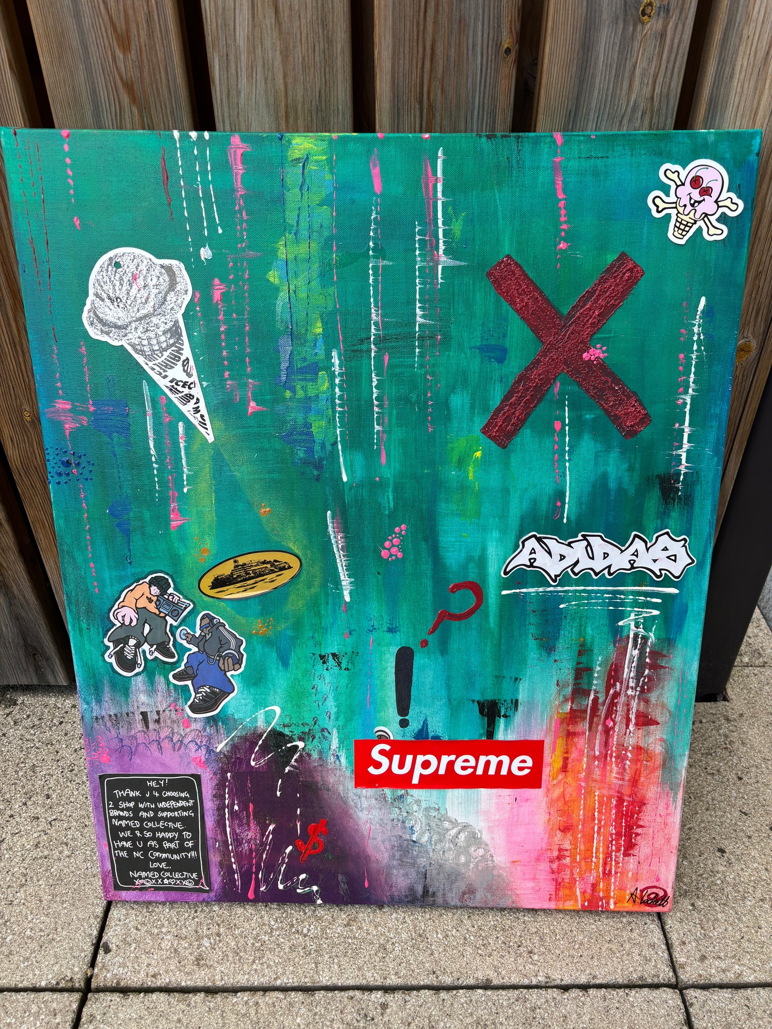 Acrylic, Glass Ball Medium, & stickers re-purposed from the artists wardrobe